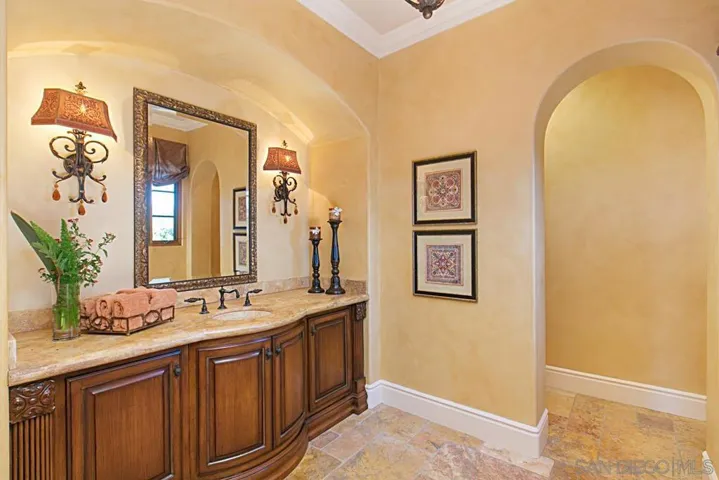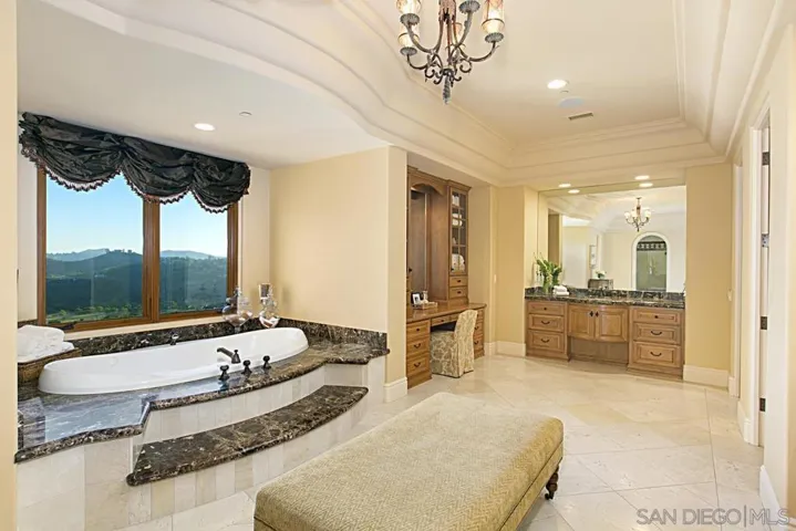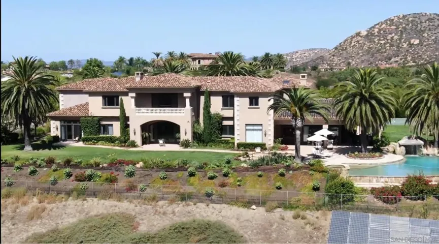 Bryce Point Estate is THE Ultimate View Property! A 2-story Mediterranean hilltop masterpiece in the guard gated community of The Heritage Custom Estates. Located at the end of a private cul-de-sac, perched high above Maderas Golf Course with breathtaking views all around. This custom home features amenities found in a luxurious resort. Finished with tumbled travertine, marble, hardwood flooring, crown moulding, granite countertops, immense stone fireplaces, water filtration system and whole house & pool solar, this home is designed with every detail in mind. The gourmet chef’s kitchen boasts an expansive granite island and opens into a spacious family room with stone fireplace, vaulted wood ceiling and entertainer’s wet bar with walk in wine cellar. Rejuvenate in the dedicated Wellness Center with gym/yoga/cardio/weight studio, locker room with steam sauna, hydrotherapy tub with waterfall, hot dry sauna and shower. Stream sports events and movies in the private cinema room with state-of-the-art sound system. The beauty of this estate extends outdoors to the large, covered veranda with living room, dining area and outdoor kitchen overlooking the lushly landscaped grounds. Further enhancing the outdoors is a vanishing edge saltwater pool with bench seating, waterfall, sit in grotto, slide, extra deep end with diving ledge and outdoor heated jetted spa. Enjoy playing sports on the sport court and large flat grassy areas. BONUS FEATURE: This estate offers a private 1-bedroom suite with living room, kitchenette and fireplace perfect for nanny or multi-generational.