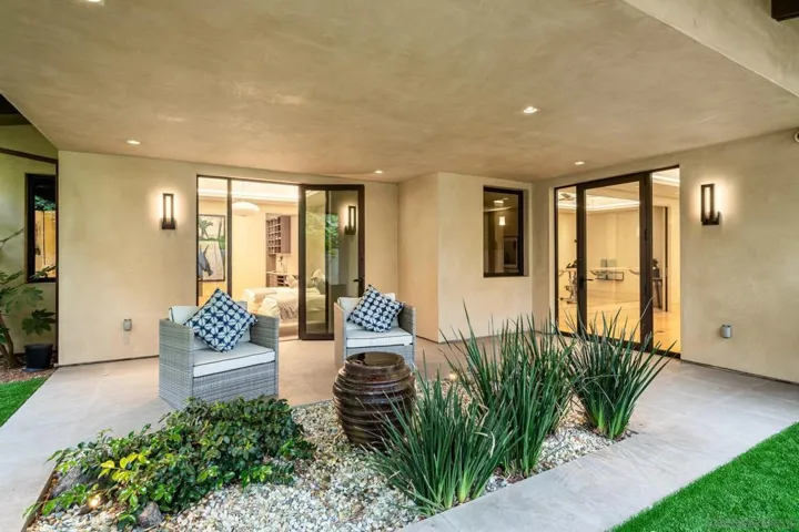Designed by renowned local architect Trip Bennett, this gated one-acre La Jolla estate masterfully blends harmonious architecture with cutting-edge sustainability. Enter through a striking courtyard featuring a fully retractable roof that brings the outdoors in. This home is LEED Gold Certified and equipped for off-grid living, showcasing more than 8,000 square feet of intentional home design, single-level layout, fully ADA accessible, private guest suite with separate entrance, top-tier appliances, smart home technology, Italian Lapitec natural stone countertops, fire-hardened exterior, locally sourced materials, a four-car garage, temperature-controlled wine storage for nearly 700 bottles, and an expansive flat lawn. For complete energy resilience, the home includes a dual-fuel generator, a 1,000-gallon propane tank, solar hot water supported by geothermal heating, and an array of 80 owned solar panels. A reverse osmosis water filtration system and independently climate-controlled zones ensure personalized comfort and efficiency throughout. This is sustainable luxury at its finest.