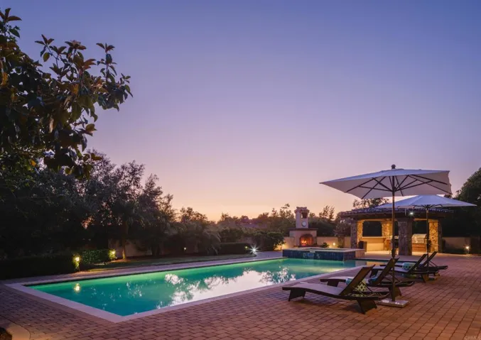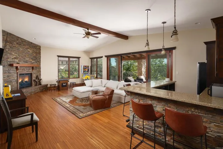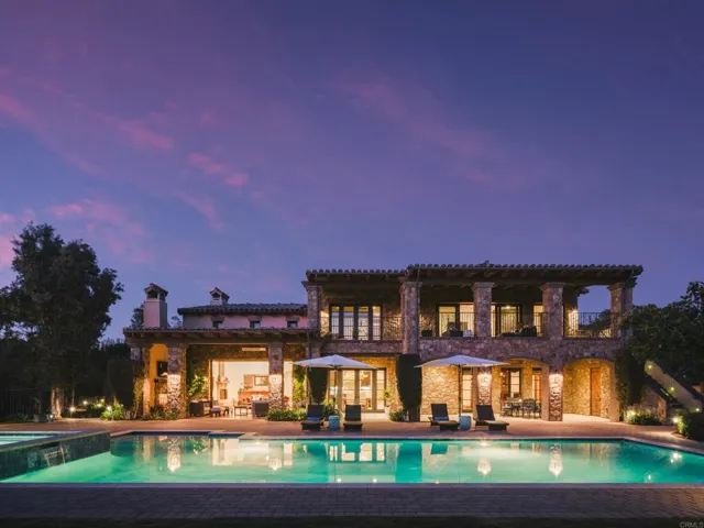 Welcome to this exceptional Henry Penner-built estate, privately gated within the prestigious Santaluz community. Thoughtfully designed for luxurious living and grand entertaining, this four-bedroom plus office residence features a seamless open floor plan and refined, timeless finishes throughout. The expansive great room flows to a built-in bar, perfect for gatherings, while the formal dining room offers an elegant space for special occasions. Movie nights transform into a cinematic experience in your private eight-seat theatre. The heart of the home is the gourmet kitchen, complete with a Wolf oven and range, Subzero refrigerator, Bosch dishwasher, and an adjacent prep kitchen-ideal for effortless hosting and everyday functionality. The main level offers two spacious bedrooms, while upstairs includes two additional bedrooms and a generous entertaining room with its own mini kitchen. Retreat to the main-level primary suite featuring a spa-like bath, outdoor spa on a private patio, and a walk-in closet with its own mini washer and dryer for added convenience. Additional highlights include a dedicated office, four-car garage, owned solar for the home and pool, and a private gated entry offering exclusivity and security. This is a rare opportunity to own a timeless Santaluz masterpiece, designed for both intimate family living and grand-scale entertaining.