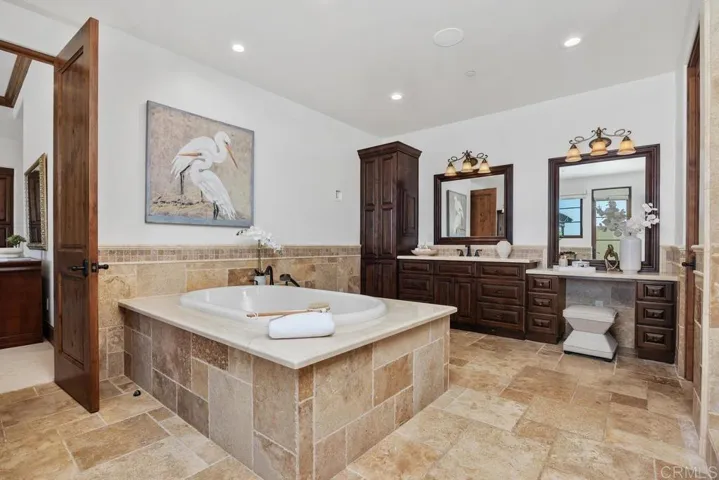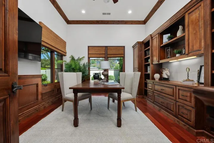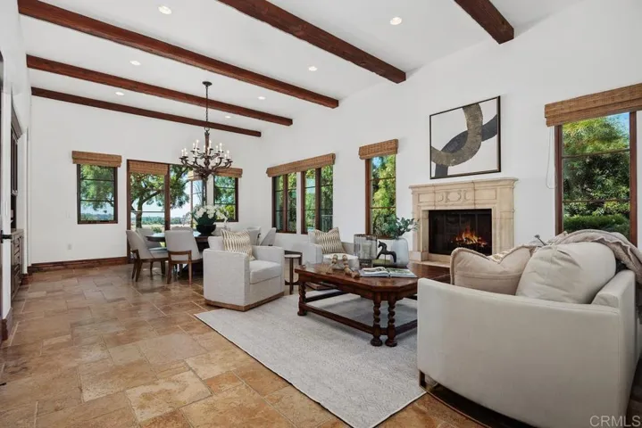 Elevated Living: Welcome to your private sanctuary in the rolling hills of Santaluz where panoramic vistas stretch for miles and luxury meets everyday ease. This custom-built estate offers a lifestyle of comfort, elegance, and connection in one of San Diego’s most sought-after- guard-gated communities. As you enter the gated motor court, you are greeted with a serene retreat that has something for everyone. This is a home where design and quality were thoughtfully curated—where daily stresses fade, laughter fills the air, and lifelong memories are made. The formal living and dining rooms provide a refined backdrop for entertaining while the chef’s kitchen – with expansive island, and walk in pantry and casual dining nook – flow seamlessly into the great room. Stacking vanishing doors connect indoor and outdoor spaces, opening to a covered loggia and fully equipped outdoor kitchen. Sport and movie enthusiasts will love the state-of-the-art home theater and adjacent entertainment lounge area and bar. The richly paneled home office, complete with built-ins and a private entrance is ideal for today’s work-from-home lifestyle. The main level primary suite is a tranquil escape, featuring a luxurious bath, an oversized walk-in closet, and a secluded patio with spa. A secondary en-suite bedroom is also located downstairs. Upstairs, three ensuite bedrooms join a guest casita with separate entrance, perfect for visitors or mulit-generational living. The backyard is an entertainer’s dream with an inviting pool and spa, sunken fire pit lounge, sport court and putting green -all offering endless fun for all ages. The four-car garage with built-in storage system provides organization for the gear and toys that accompany an active lifestyle. Your environment reflects your lifestyle and this one-of-a-kind home is paradise waiting for you.
