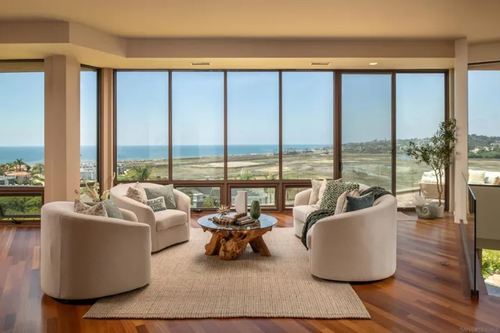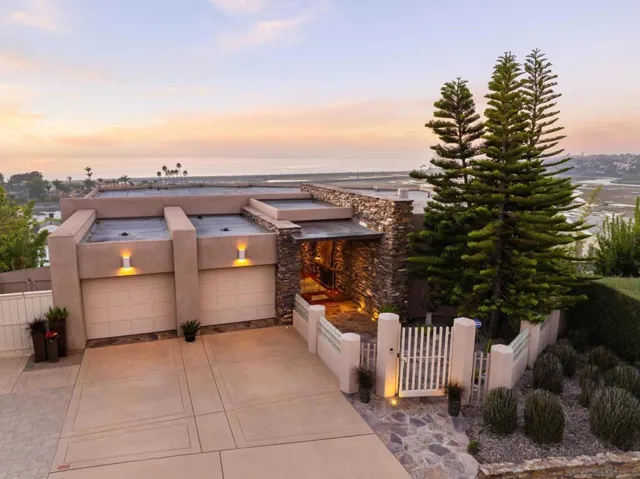 PRICE IMPROVEMENT! Seller will entertain offers between $7,895,000 and $8,495,000. Unrivaled PANORAMIC OCEAN and LAGOON VIEWS command attention from the moment you arrive—an ever-present backdrop that defines the soul of this extraordinary residence. A minimalist exterior conceals the visual drama inside, where a towering glass entry door unveils sweeping vistas that stretch to the horizon. Thoughtfully crafted to echo the natural landscape, warm stacked stone walls flow from the formal entry into the expansive great room, where walls of glass dissolve boundaries between indoor and outdoor living. Rich Brazilian cherrywood floors, rainforest green granite, and hand-engraved hardware add texture and warmth, grounding the home in timeless organic luxury. Designed with flexibility in mind, the layout offers two separate levels for a variety of lifestyles—from seamless single-level living to private, multigenerational spaces. The main floor includes the ocean-view primary suite with dual spa-like baths, a chef’s kitchen with Viking appliances, laundry room, and attached two-car garage. Downstairs, three bedrooms, a bonus room with second kitchen, and additional laundry hookups open to an outdoor entertaining area with built-in BBQ, fire pit, and room for a pool or pickleball court. Just minutes to the beach, freeway, top-rated schools, and the vibrant Cedros Design District—this rare coastal sanctuary offers breathtaking views, thoughtful design, and unmatched serenity.