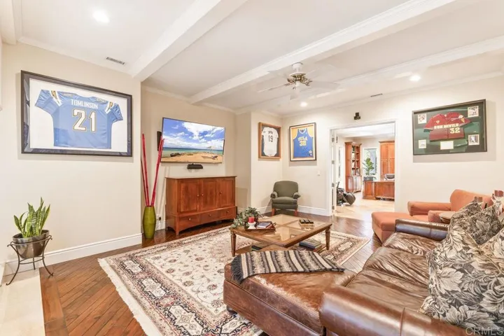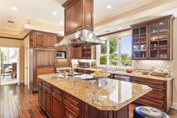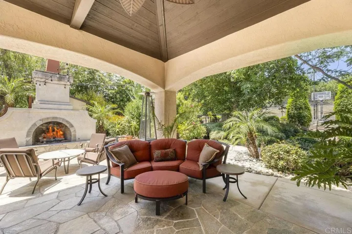 Welcome to your own 1.32 acre resort with large pool plus beach entry, hot tub, sport court, large koi pond, 40 electric solar panels, pool heating solar, garden, fruit trees, sunset views, and plenty of parking. The 2-story home has had many upgrades throughout. The spacious floorplan has a 20+ foot ceiling in the living room directly in front of the entry, a first floor bedroom suite with full bath, and dining room. The kitchen boasts a Wolf gas cooktop in the center island with hood and sink, a large sink facing the window overlooking the koi pond, separate Subzero refrigerator and freezer, dishwasher, double ovens, 2 hidden double trash drawers, warming drawer, bread baskets to keep bread fresh, a huge walk-in pantry, microwave, and a roll-up hideout for counter appliances. The large breakfast nook leads to the family room with large screen wall-mounted TV. Further past is the gorgeous office edition with beam ceilings and beautiful built-in cabinets. The 4 car garage has ample cabinet and ceiling storage. The elegant stairway to the second floor was remodeled in 2007. There is the primary suite with windows looking out toward the west to northwest to see magnificent sunsets. A large bathroom with steam shower and large tub with views is on the other side of the classy 3-sided fireplace.