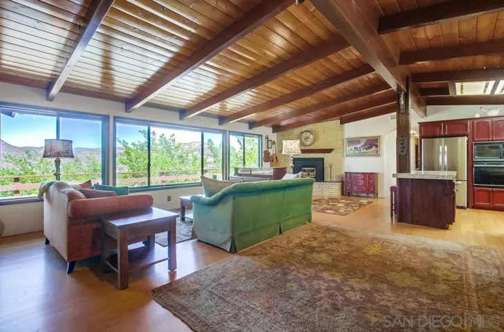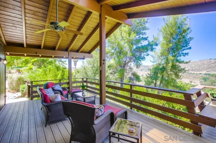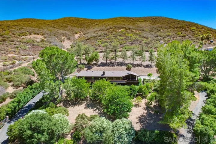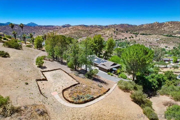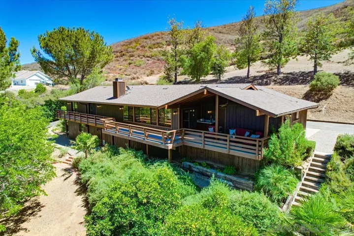 Single-story retreat on just over 4 acres with sweeping views! This versatile property features 3 bedrooms, 2.5 bathrooms, plus a separate studio apartment that is ideal for guests or rental income. Inside, wood-beam ceilings and bamboo floors create warmth and character, while walls of windows frame unobstructed mountain views in nearly every room. A wraparound Trex deck with built-in seating provides the perfect spot to soak in the views or host friends and family. The kitchen includes a walk-in pantry and flows seamlessly into the dining and living spaces. The primary suite offers an updated bath, serene views, and French doors opening to the deck. A standout feature is the large, flat pad with water and electricity already in place that is perfect for building a pool, greenhouse, or ADU with breathtaking panoramic views. Additional upgrades include new HVAC and ducting (2023), newer roof (2017), new water heater, new gutters, freshly painted exterior, leased solar, and two gated entries. Multiple fruit trees including orange, lemon, plum, apricot, fig, and persimmon complete this private escape. Don’t miss the chance to own this rare property that combines privacy, versatility, and unforgettable views.
