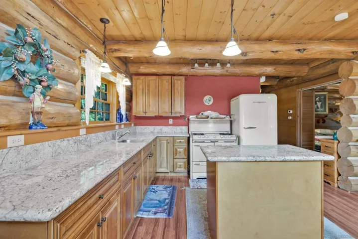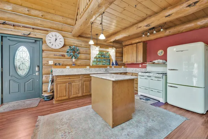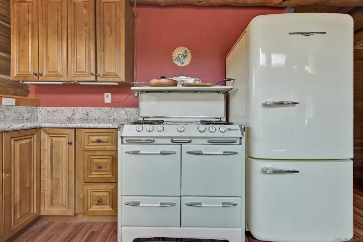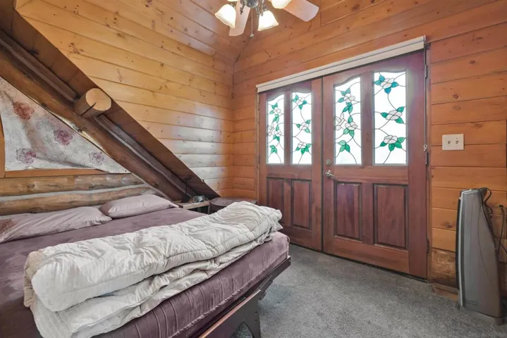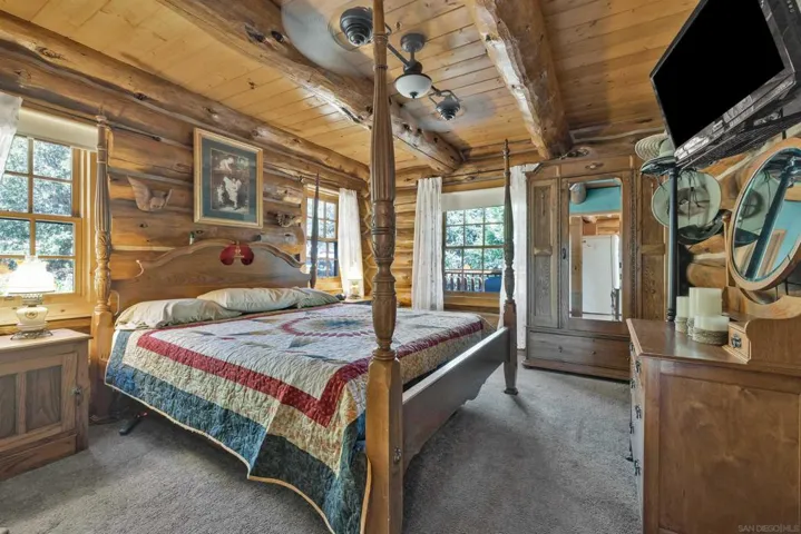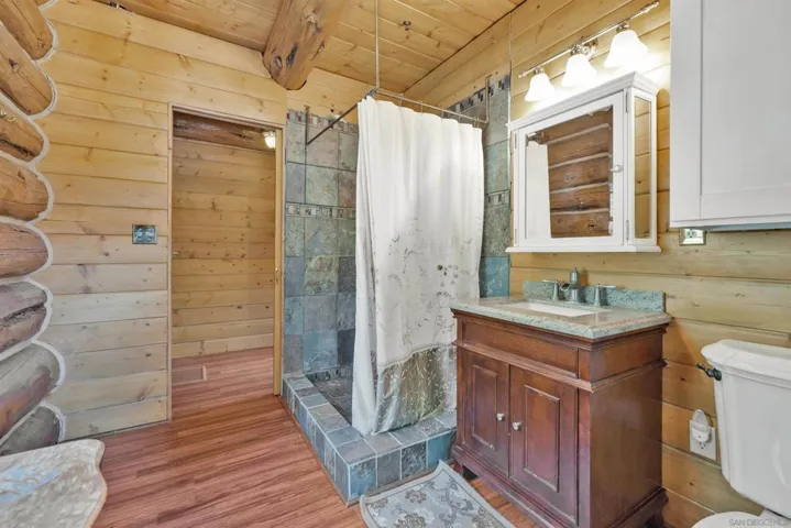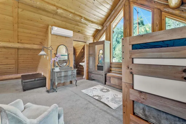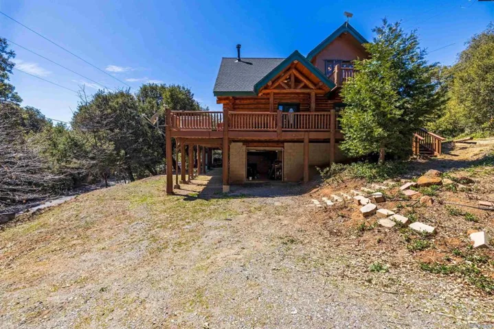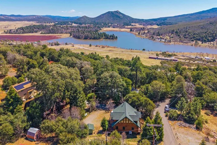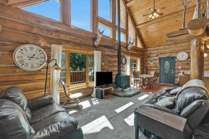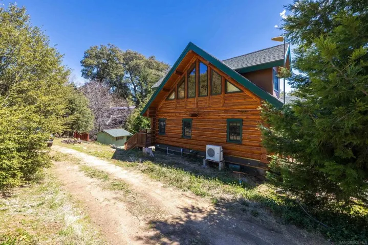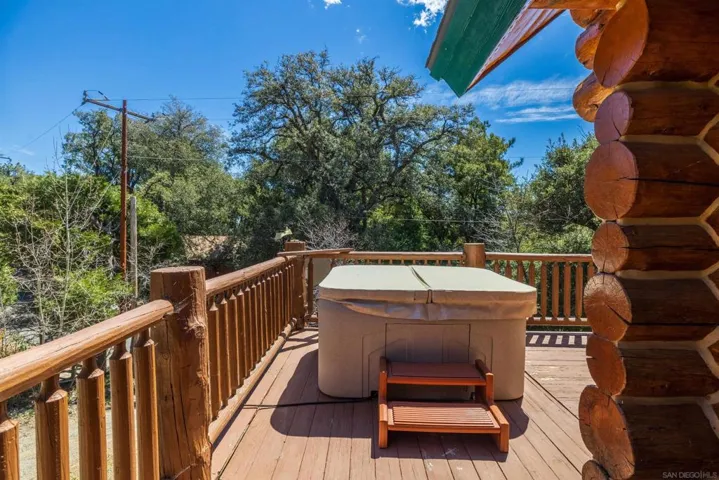Surrounded by the natural beauty of Julian’s Lake Cuyamaca neighborhood, this 2007-built log cabin offers a rare mix of rustic character and modern convenience. Offering 1,328 sq. ft. of living space, the home features one bedroom, a loft, an optional bedroom, and two full bathrooms, creating a versatile layout for full-time living, weekend retreats, or guest accommodations. The inviting main living area is centered around a wood-burning stove, with a furnace and mini-split system ensuring year-round comfort. The kitchen pairs nostalgic character with everyday functionality, showcasing a retro NorthStar refrigerator-freezer and a classic O’Keeffe & Merritt stove. A full bath on the main level opens directly to a spacious outdoor deck with a private hot tub—perfect for stargazing in the crisp mountain air. The main-level bedroom offers serene forest views, while the upstairs loft and optional bedroom provide flexible space for guests, a home office, or creative pursuits. The optional room, separated by a rustic sliding barn door, opens to a private upper deck. A second full bath features a deep soaking tub and its own mini-split system. The lower level includes a basement garage and bonus area ideal for hobbies, storage, or workshop space. Combining vintage style, thoughtful updates, and a peaceful mountain setting, this property presents a rare opportunity as a primary residence, vacation home, or short-term rental in one of Julian’s most desirable neighborhoods.