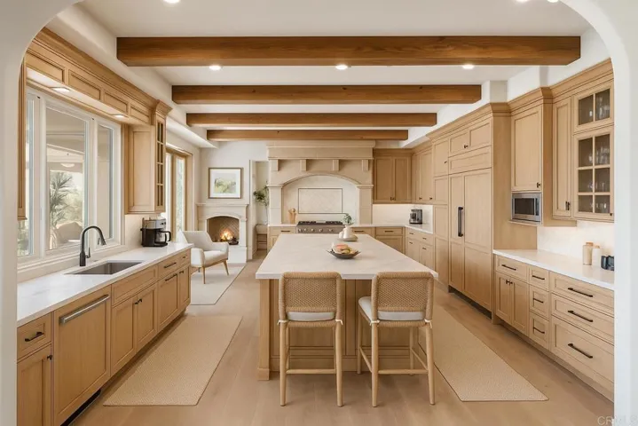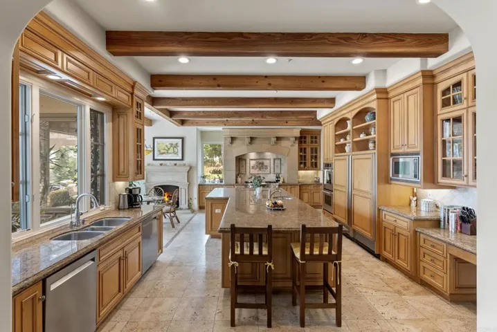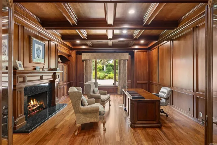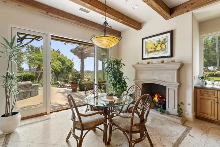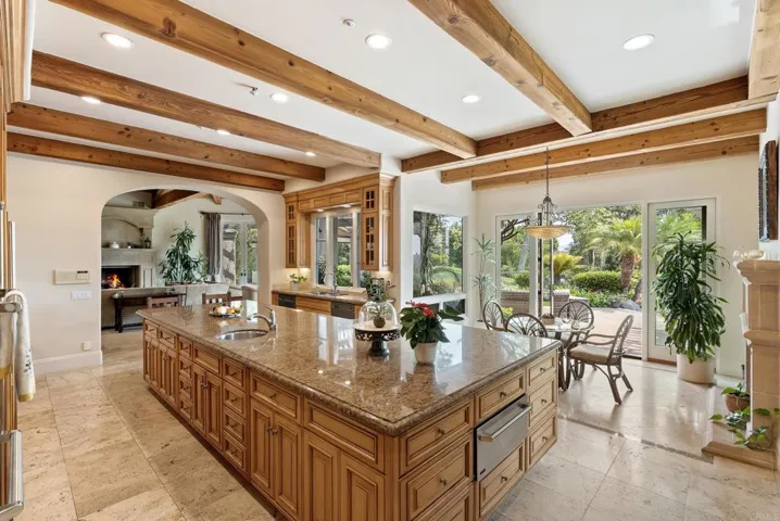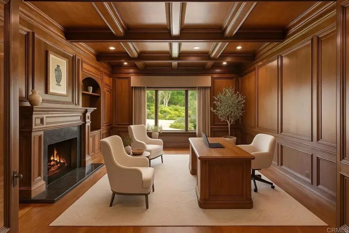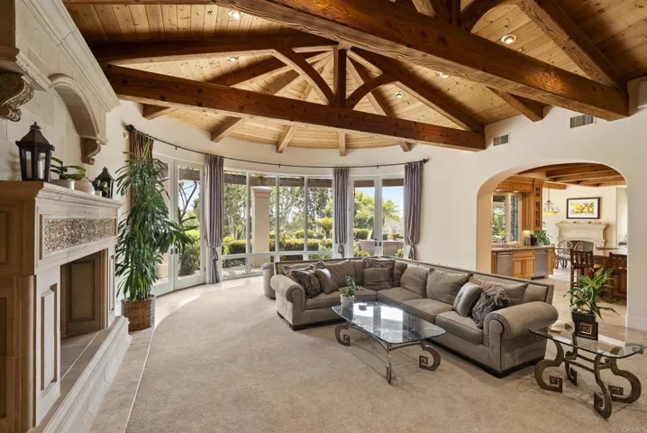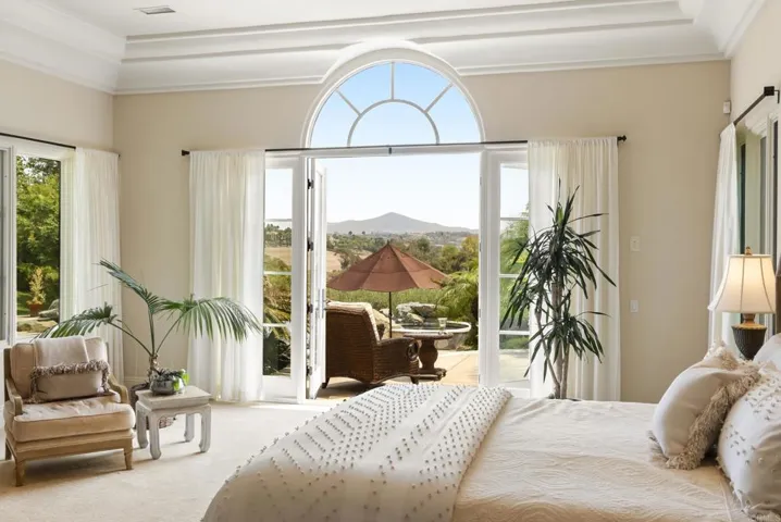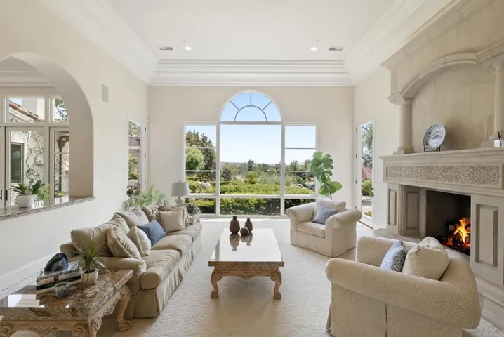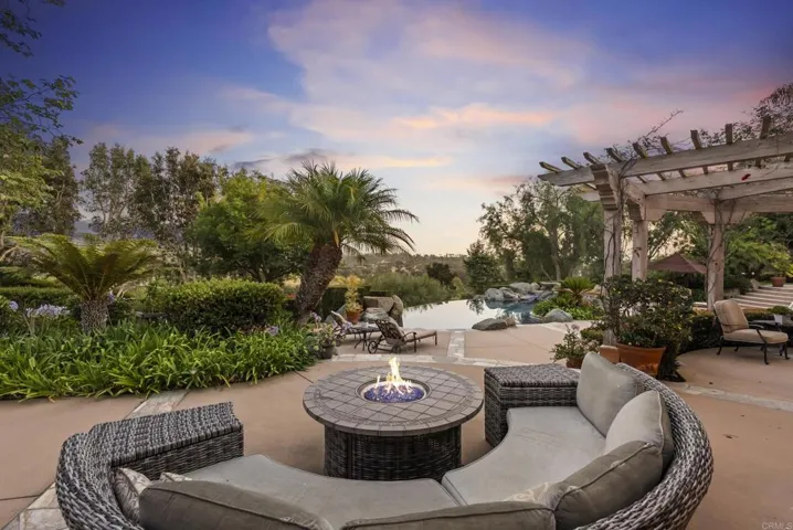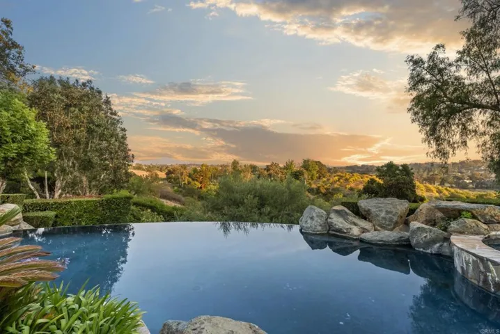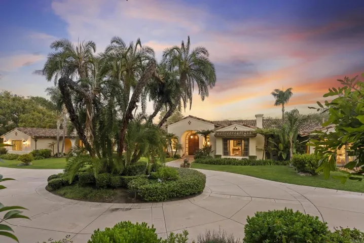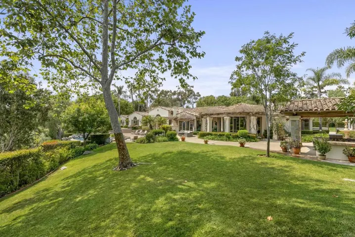 Welcome to 7057 Rancho Cielo, a stunning single-level estate perfectly positioned in the prestigious Covenant of Rancho Santa Fe. Encompassing over three serene acres, this architectural treasure captures uninterrupted southern mountain views and offers a lifestyle defined by privacy, elegance, and effortless California living. Behind a private gated entry, a long circular driveway winds through manicured gardens, setting the stage for the refined residence within. Spanning 8,424 square feet, the home offers both formal and informal living and dining spaces, designed for seamless entertaining and everyday comfort. Walls of glass invite natural light and frame pastoral vistas, while a 160-bottle climate-controlled wine room with adjacent bar elevates gatherings with friends and family. Five bedrooms and seven baths, plus a detached 432-square-foot casita currently outfitted as a gym, provide versatile accommodations for guests, work, or recreation. Outdoors, the resort-style grounds inspire connection and relaxation with a vanishing-edge pool and spa, covered outdoor kitchen, multiple lounge and dining areas, and a charming family orchard. All of this is set within minutes of the Rancho Santa Fe Village, award-winning schools, and world-class golf, making 7057 Rancho Cielo not just a home, but a statement in luxury and the art of single-level living.