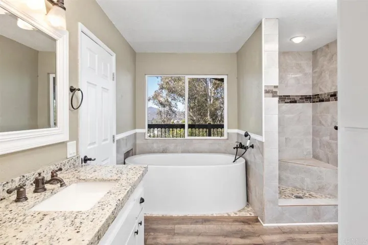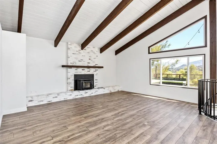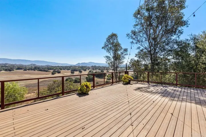 Perched on 2.08 acres with jaw dropping panoramic views of Palomar Mountain and Valley Center’s rolling hills, this unique and extensively renovated split-level property offers space, privacy, and charm in every direction. From the gated circular drive, you will find a blend of modern updates and timeless country character. Freshly painted inside and out, the home features new luxury vinyl plank flooring throughout, updated ceiling fans, a modern new spiral staircase railing, and so much more! The main level’s freshly painted light and bright vaulted open-beam ceilings and dramatic great room look out to WOW views and set the stage for everything from cozy nights by the wood-burning fireplace to lively gatherings. The entertainer’s kitchen features granite counters, an oversized island with cooktop, a walk-in pantry, and ample cabinetry. The dining area opens to an expansive, zero-maintenance EON wrap-around deck where you can enjoy breathtaking sunsets and starlit skies. The primary suite includes a brick fireplace, private balcony, and a spa-like bath with a freestanding tub. The extensively renovated lower-level bedroom and living space offers endless possibilities for a gym, guest suite, multi-generational living. Outdoors offers a playground for all ages; wander winding paths through lush landscaping, explore the unique whimsical replica western mine, or garden in the fenced vegetable beds. Pipe corrals are ready for horses, and a versatile outbuilding can serve as a workshop, art studio, office, playroom or whatever you can envision! Additional features include an attached 3-car garage with built-in cabinets and workbenches, leased solar ($303/mo), and no HOA! Truly an enchanting property not to miss!