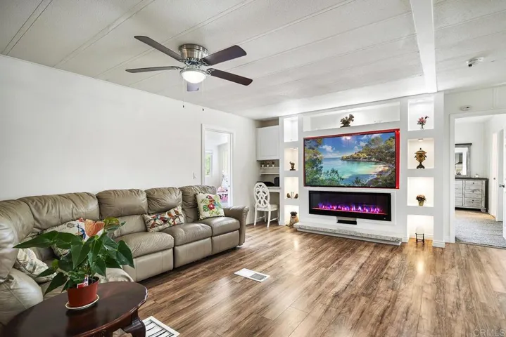 Welcome to this rare ALL-AGE, LAND-OWNED home in the GATED Escondido Views community—no space rent! This beautifully upgraded 4-bedroom, 2-bath home with a bonus room truly has it all—space, upgrades, and lifestyle—in one of Southwest Escondido’s most desirable neighborhoods. Inside, enjoy fresh interior and exterior paint, upgraded flooring, and a remodeled kitchen featuring stunning custom granite countertops, a huge eat-up peninsula, GE stainless steel appliances, and a gas range with griddle—perfect for any home chef. The open-concept layout flows to a spacious living room with a custom built-in entertainment center with an electric fireplace, accommodating up to an 80-inch flat screen. Imagine preparing meals at the peninsula while guests relax by the fireplace! Step outside to impressive curb appeal featuring beautiful landscaping—low-maintenance pavers, pea gravel, turf, and one of the community’s most spacious view lots—ideal for entertaining. The new fence and retaining wall offer privacy, while the upgraded carport with curved supports provide space for up to 5 vehicles. A large 13×15 shed offers plenty of storage or workshop space. Thoughtfully upgraded and maintained with energy-efficient dual-pane windows, regular roof coatings (most recent in August), and newer subflooring and skirting, this home is truly move-in ready. The spacious and functional split floor plan features a private primary suite with two closets and a remodeled bath, along with three secondary bedrooms, a full bath, and a flexible bonus room that can serve as a home office, hobby space, or even a fifth bedroom. For a low HOA of just $268/month, enjoy resort-style amenities: swimming pool, kiddie pool, spa, cabanas, fitness center, clubhouse, game rooms, playground, and basketball court. All this within walking distance of shopping, dining, banking, and just minutes to Lake Hodges, public transit, and major freeways. Part of the acclaimed Escondido Union School District, including Bernardo Elementary, Bear Valley Middle, and San Pasqual High, plus nearby Classical Academy.