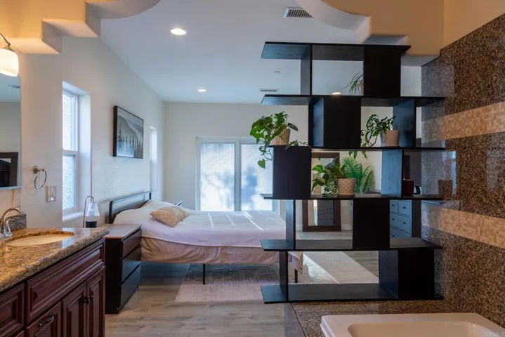 Enjoy sweeping south- and west-facing vistas from this thoughtfully designed residence, nestled in a scenic setting. The open-concept layout features a spacious kitchen with ample cabinetry and countertop space, seamlessly connecting to a generous dining area and inviting living room—perfect for both daily living and entertaining. Interior highlights include soaring ceilings, expansive balconies, an elegant iron-and-glass entry door, and decorative wrought-iron railings. A versatile bonus room offers the flexibility to serve as a home office, gym, or playroom. Step outside to a tranquil backyard with a designated patio area ideal for outdoor dining, plus additional space for gardening or quiet relaxation. With timeless design elements and functional living areas, this home offers an exceptional lifestyle in a stunning natural environment.