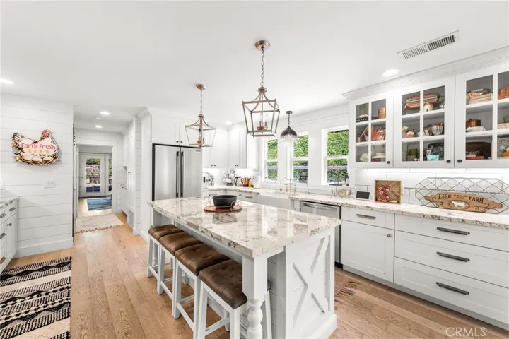 Nestled on an elevated 2.29-acre lot in a prime Fallbrook location, this picture-perfect country retreat is a rare blend of elegance, thoughtful design, tranquility, and natural beauty. This one-of-a-kind estate features a beautifully upgraded two-story Craftsman-style home paired with a separate, fully appointed guest house—ideal for multi-generational living or hosting extended stays. Step inside the main residence and you’re immediately welcomed by an open-concept formal living and dining space, filled with natural light, custom cabinetry, and a cozy wood-burning fireplace. The heart of the home is the chef’s dream kitchen—boasting a professional-grade 6-burner stove, sleek white cabinetry, granite countertops, an oversized island, and a spacious separate walk-in pantry. The main-level primary suite offers the perfect private retreat, featuring private patio access, a spa-inspired bathroom with a freestanding soaking tub, dual vanities, a large walk-in shower, and generous closet space. Upstairs, an airy loft provides flexible living or office space, along with two generously sized bedrooms—each with ample closet space, large windows, ceiling fans, and two beautifully appointed bathrooms. The separate guest home offers complete independence with its own full kitchen, living and dining area, bedroom, and bathroom—perfect for extended family, guests, or rental opportunities. Outdoors, the grounds are simply spectacular: mature trees, a hobby orchard including orange, apple, grapefruit, avocados, mango, fig, pears, plumb trees, manicured gardens, expansive lawns, and breathtaking views. Whether you’re entertaining, gardening, or simply enjoying the peaceful surroundings, this property offers a lifestyle that is truly unmatched. Additional highlights include fully owned solar and power-walls for a true “off grid” style property along with thoughtful upgrades throughout.