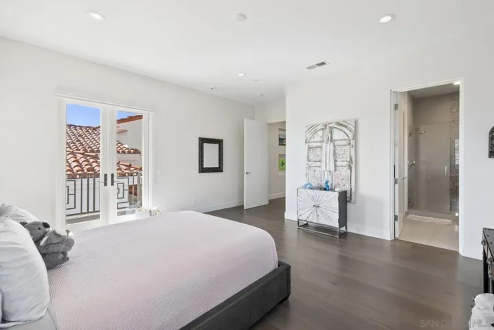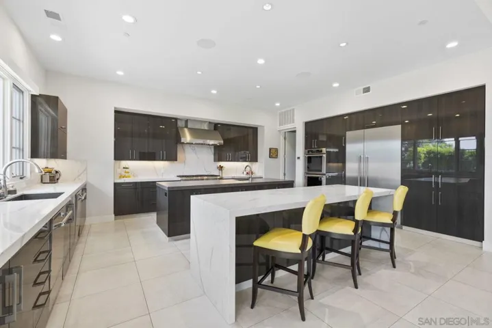 This spectacular Spanish Contemporary estate offers 7,016 SF of modern luxury on nearly an acre in the gated enclave of The Ridge Estates in Del Mar Mesa. Thoughtfully designed with extraordinary attention to detail, the home features 5 spacious ensuite bedrooms plus an office with full bath (optional 6th bedroom). A seamless blend of modern design and eco-conscious materials creates a sophisticated yet comfortable retreat. Floor-to-ceiling cantina doors open to true indoor-outdoor living: a covered loggia, sparkling pool, expansive turf play area, outdoor kitchen, and privacy hedges. The chef’s kitchen boasts Thermador appliances, dual islands, and a walk-in pantry. The primary suite offers a spa-inspired bathroom, elegant custom closet system, sleek fireplace, and private deck with 180° panoramic northern and westerly views. Additional highlights include rooftop solar, a 4-car garage with epoxy floors and abundant storage, soaring ceilings, oversized hallways, and designer finishes throughout. Nestled among Del Mar Mesa’s rolling landscapes yet just minutes from shopping, dining, and freeway access, this rare estate combines elegance, privacy, and breathtaking views—defining luxury living in North County San Diego.