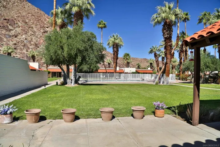 Well cared for De Anza Villas unit close to the heated pool! This home has upgraded Saltillo tile floor and dual pane windows throughout. The front patio faces South and is walled in for privacy. The large back patio faces North out to the courtyard and pool/spa area with beautiful views of the mountains. This home is offered mostly furnished and is ready to move in at close of escrow!