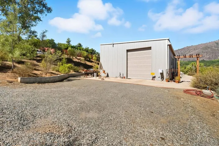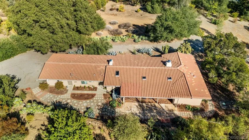 Tucked at the end of a wooded cul-de-sac is a remarkably private home with two major structures and a storage shed. The pristine main home is single story with tile floors & tile roof, two fireplaces, beamed ceilings, split a/c, laundry room & two car garage. The additional 2100 sq. ft. multi-purpose building has workrooms, loft bedrooms, bathrooms, utility kitchen, a/c, 16′ ceilings, a roll-up door for a travel trailer and huge view windows to enjoy acres of lush groves and the majestic Palomar Mountain. The property is nestled among groves and nurseries for creative peacefulness. There are dozens of irrigated fruit trees including apple, avocado, orange, lemon, lime, pomegranate, kumquat, peach, persimmon & macadamia. The ambiance is one of total relaxation. Fresh mountain air, birds chirping, quail scooting, resident roadrunners, hawks and eagles all make for a truly enjoyable lifestyle.
