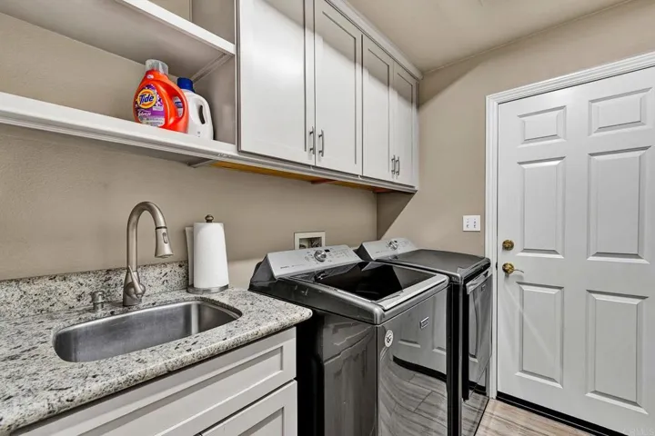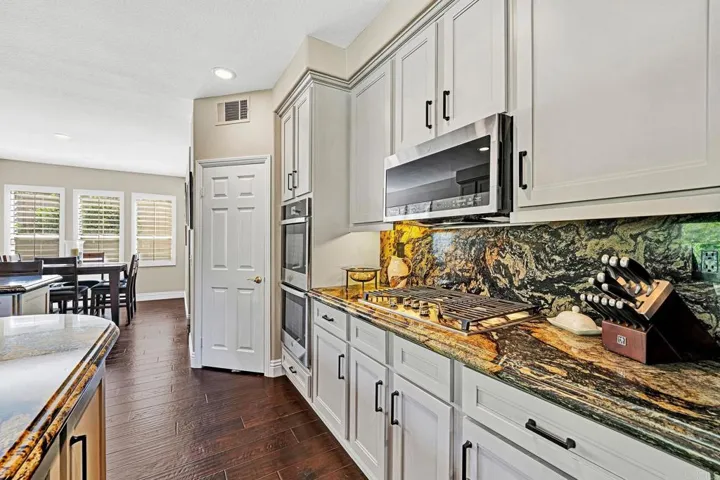 Welcome to this stunning 5-bedroom, 3-bath home offering nearly 3,000 sq. ft. of living space in one of Oceanside’s most desirable neighborhoods. Located in the Marlborough Country Estates enclave of Jeffries Ranch, this home has been beautifully updated and meticulously cared for by the original owners. You are greeted by a charming front porch that opens to a spacious living and dining room with gleaming hardwood floors that flow throughout the downstairs, complemented by custom white window shutters. The inviting family room features a gorgeous updated stone fireplace and a built-in custom entertainment center, located just off the kitchen. The remodeled kitchen offers custom creamy-white cabinetry, dark granite countertops, a large island, and new GE appliances—perfect for family gatherings and entertaining. A cozy breakfast area overlooks the private backyard, creating the ideal space to enjoy your morning coffee. A conveniently located downstairs bedroom and full bath provide flexibility for guests, multigenerational living, or a home office. Upstairs, the luxurious primary suite features remodeled spa-inspired bath with a separate tub and walk-in shower, two sink areas, and elegant finishes, plus three additional spacious bedrooms. Set on a 0.26-acre lot with no rear neighbors, the property backs to lush natural vegetation, creating a private and tranquil setting. The entertainer’s backyard is a true highlight—complete with an outdoor built-in BBQ, firepit, manicured lawn, and multiple seating areas ideal for relaxing or hosting guests. Additional features include an oversized three-car garage and close proximity to top-rated schools, shopping, dining, and parks. This rare opportunity combines modern comfort, timeless style, and exceptional outdoor living in the heart of Jeffries Ranch.