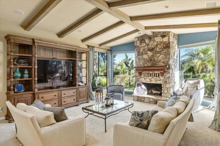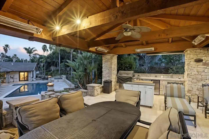 Welcome to a sanctuary of sophistication in West Escondido. This gated estate blends timeless design with modern luxury, offering a lifestyle of serenity, beauty, and effortless entertaining. From the moment you arrive, the circular driveway and lush gardens set a gracious tone. Beveled glass doors open to a sunlit interior where vaulted ceilings and travertine floors lead to a living room anchored by a dramatic stone fireplace and panoramic views of nature. Designed for gatherings, and fun… See Supplement A circular drive leads to a stunning entry framed by lush landscaping and beveled glass doors. Inside, vaulted ceilings, travertine floors, and a dramatic stone fireplace define the living room. The formal dining room opens to the pool via folding glass doors and features custom built-ins. The kitchen includes a butcher block island, Miele coffee station, breakfast nook, pantry, and pass-through window to the patio. Adjacent is a spacious laundry room with ample cabinetry. The home offers 5 bedrooms, including a luxurious owner’s suite with walk-in closet, spa-like bath, and an attached office with built-ins. Outdoor amenities include a 38’ lap pool, raised spa, fire-and-ice features, private cabana, putting green with sand trap, and a 23×19 ft gazebo with granite counters, BBQ, heaters, fans, and TV. Fruit trees, rose garden, scenic walkway, and night lighting complete the resort-style grounds. Epoxy-floored garage with LED lighting and storage. A rare opportunity for refined living. The kitchen is both warm and functional, with a butcher block island, Miele coffee station, breakfast nook, and pass-through window to the patio. A spacious laundry room adds everyday ease. The owner’s suite is a retreat unto itself, with a spa-inspired bath, walk-in closet, and an adjoining office with granite counters and built-ins. Three additional bedrooms offer comfort and privacy. Outside, the grounds unfold like a private resort: lap pool, raised spa, fire-and-ice features, putting green, cabana, and a fully equipped gazebo with scenic walkway. Fruit trees, a rose garden, and curated lighting complete the ambiance. This is more than a home—it’s a destination.