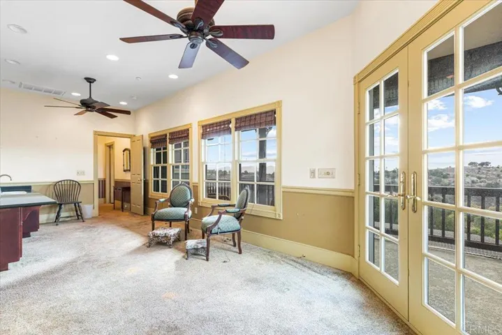 Perched above the valley on 2.27 acres of gently sloping land, this timeless Victorian-inspired residence offers a rare blend of architectural grace and rural serenity. With over 3,100 square feet of beautifully detailed living space, this peaceful country escape invites you to enjoy sweeping sunset views, modern comforts, and the freedom to raise animals or create your dream garden retreat. Step inside to discover soaring ceilings, vintage-style fixtures, and an inviting floor plan that balances warmth with grandeur. The main level features a sun-drenched den, a formal dining room framed by large windows, and a well-appointed kitchen with custom cabinetry and a nod to the home’s vintage character. The generous downstairs bedroom offers flexibility for guests or multi-generational living. Upstairs, the spacious primary suite serves as a private sanctuary—complete with panoramic views, plush carpeting, and an original clawfoot tub in the en suite bath. Two additional bedrooms provide peaceful spaces for rest or creativity. Step outside to soak in breathtaking sunset views from the balcony or entertain on the wraparound porch. The backyard features a garden-ready area, stone retaining walls, and ample space for animals and livestock—all set against a backdrop of open skies and rolling hills. Modern upgrades include central air conditioning, a fire sprinkler system, reinforced foundation for earthquake safety, and an HVAC system for year-round comfort. Located just minutes from downtown Ramona and Mountain Valley Ranch, this exceptional property combines Victorian charm with the relaxed lifestyle of San Diego’s countryside.