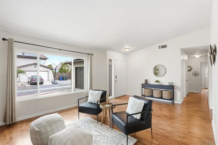 Discover this beautifully upgraded single-story home in the highly desirable Rancho San Diego community. Ideally positioned on an elevated lot with picturesque mountain views, this residence features an open floorplan with high vaulted ceilings, creating a bright and airy feel throughout. Enjoy both a spacious family room and living room, ideal for gatherings or quiet relaxation. The modern upgraded kitchen offers stainless steel appliances and stylish finishes, while dual pane windows enhance comfort and efficiency. Step outside to a large, covered patio overlooking the low-maintenance backyard with turf—south part of the lot conveys with the home, it allows for extra expansion of the backyard, perfect for outdoor living/gardening/extra storage space or more!! Situated on a corner lot with a large driveway and extra assigned parking, this home offers exceptional convenience. Additional highlights include leased solar for energy savings and access to two community pools, parks, tennis courts, and playgrounds. Close to hiking trails, schools, shopping, major highways and more! Experience resort-style living with stunning views in one of East County’s most sought-after neighborhoods!