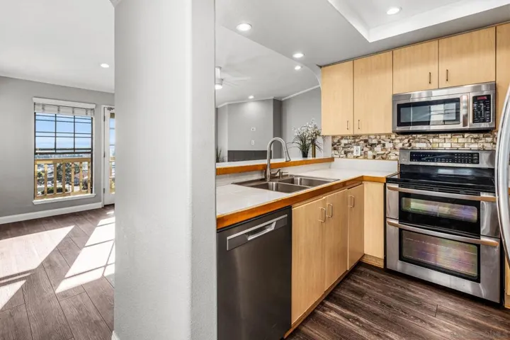 Elevated coastal living at 2235 Linwood St, Unit A7, a top-floor end unit flawlessly positioned above the historic charm of Old Town and the coastal beauty of Point Loma. Dual master-suite layout, offering two generously sized bedrooms each with its own full bath and in-unit laundry. Inside, luxury vinyl plank flooring, expansive windows that flood the space with natural light, and a private balcony where you can unwind to panoramic views of the San Diego Bay, Point Loma, and the glowing city skyline at sunset. 4 electric burner stove with 2 oven handlebars. Dishwasher and Microwave. Electric views from the kitchen. Enjoy the convenience of a gated community featuring a sparkling pool, spa, and fitness center, all just moments from the vibrant restaurants, boutiques, and cultural experiences of Old Town, Mission Hills, and Downtown San Diego. Two assigned parking spaces, including a private garage, ensure security. HOA covering exterior maintenance, water, and trash, this home welcomes you to focus on what matters most enjoying a lifestyle with million-dollar views and timeless San Diego energy. Luxury, convenience, and location.