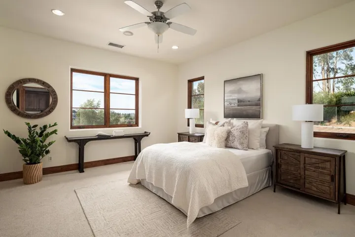 Set on 2.51 elevated view acres in the exclusive Covenant of Rancho Santa Fe, this custom-built 2009 estate has been recently refreshed and showcases 4,523 sq. ft. of beautifully scaled single-level living. Designed for both grand entertaining and everyday enjoyment, the home features soaring ceilings, an open flowing floor plan, and seamless indoor/outdoor living. The great room, with its stone-clad fireplace, lift-and-slide doors, and beverage bar, opens to the chef’s kitchen complete with a sun-filled breakfast area, copper sink, and bar seating. Additional highlights include a formal dining room, artisan-crafted office/library, secondary office, and a powder room. The luxurious primary suite offers a cozy fireplace, spa-inspired bath, and a generous custom-appointed dressing room. Three additional bedroom suites provide comfort for family or guests. Outdoor living is unrivaled, with a magnificent covered living/dining room and fireplace overlooking the resort-style pool and spa, outdoor shower, and expansive lounge areas—perfect for taking in the sweeping, peaceful views. Additional features include: wood and travertine flooring, whole-house and pool solar, raised-bed vegetable gardens, extensive chicken coop housing, gated entry and cul-de-sac location, garaging for 3 cars. Close to equestrian trails, the RSF Village, Golf and Tennis Clubs, and award-winning Roger Rowe schools, this estate blends elegance, comfort, and convenience in one of Rancho Santa Fe’s most coveted settings. Set on 2.51 elevated view acres in the exclusive Covenant of Rancho Santa Fe, this custom-built 2009 estate has been recently refreshed and showcases 4,523 sq. ft. of beautifully scaled single-level living. Designed for both grand entertaining and everyday enjoyment, the home features soaring ceilings, an open flowing floor plan, and seamless indoor/outdoor living. The great room, with its stone-clad fireplace, lift-and-slide doors, and beverage bar, opens to the chef’s kitchen complete with a sun-filled breakfast area, copper sink, and bar seating. Additional highlights include a formal dining room, artisan-crafted office/library, secondary office, and a powder room. The luxurious primary suite offers a cozy fireplace, spa-inspired bath, and a generous custom-appointed dressing room. Three additional bedroom suites provide comfort for family or guests. Outdoor living is unrivaled, with a magnificent covered living/dining room and fireplace overlooking the resort-style pool and spa, outdoor shower, and expansive lounge areas—perfect for taking in the sweeping, peaceful views. Additional features include: wood and travertine flooring, whole-house and pool solar, raised-bed vegetable gardens, extensive chicken coop housing, gated entry and cul-de-sac location, garaging for 3 cars. Close to equestrian trails, the RSF Village, Golf and Tennis Clubs, and award-winning Roger Rowe schools, this estate blends elegance, comfort, and convenience in one of Rancho Santa Fe’s most coveted settings.