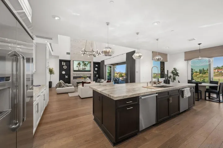 ~ Incredible Opportunity!~ Set above the Rancho Santa Fe Farms Golf Course, this Like-New & custom modern estate offers rare privacy, sophistication, and seamless indoor/outdoor living. Panoramic Views across six golf holes, the estate is filled with natural light and designed for five-star resort-level comfort. A wall of LaCantina-style bifold doors opens the vaulted Great Room to a covered outdoor living area, private pool/spa, fire pit & Summer kitchen, creating a seamless entertaining extension of the home. The gourmet kitchen features custom cabinetry, high-end Dacor appliances, Miele dual dishwashers and built-in coffee maker, walk-in pantry, nearby outdoor vegetable/fruit garden, and interior designer lighting chosen with a curator’s eye. Control4 technology, surround sound audio, Owned SOLAR, custom window treatments, and beautiful custom built-ins. The main-floor primary suite includes a walk-in closet and a spa-style bath appointed with refined finishes, offering a quiet retreat. Outdoor living is elevated by a German-engineered Algarve louvered roof with wind-rated shades, built-in heaters, full landscape lighting, irrigation, artificial turf, BBQ, and a beautiful water feature, all oriented toward the sweeping golf course views in the backdrop. Now this is a true modern sanctuary within The Farms, and one of its most rare and complete turnkey offerings.