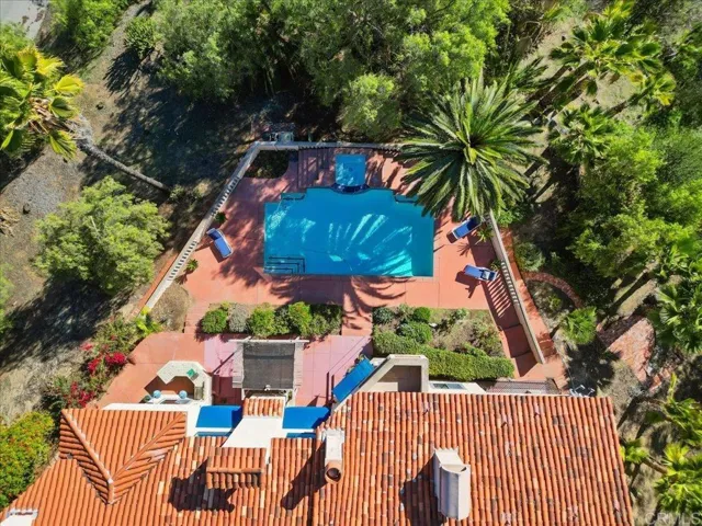 A TIMELESS SPANISH REVIVAL HOME – Set on 3.43 private acres with beautiful eastern views, this 5,388 sq. ft. Spanish Revival estate (built in 1991) exudes timeless architectural character and exceptional craftsmanship. Featuring 5 bedrooms and 6.5 baths, the residence showcases classic period details including 6 fireplaces, 4 balconies, and 4 inviting patios—each space thoughtfully designed for both everyday living and grand-scale entertaining. A grand welcome begins at the 8-foot solid oak double entry doors, opening to a large, spacious living room with soaring 21-foot ceilings and dual sets of French doors leading to the expansive outdoor terrace. A striking 20-foot brick fireplace creates a dramatic outdoor focal point beside the 36′ x 14′ in-ground pool and built-in spa—an entertainer’s dream. The kitchen offers a rare and charming touch with its own fireplace, while one of the exterior patios features another, perfect for al fresco evenings. Throughout the home, the rich authenticity of Saltillo tile flooring and Talavera-style tilework brings warmth and artistry—most notably showcased on the solid wood staircase, where Talavera risers pair beautifully with a wrought iron chandelier overhead. A second wrought iron chandelier graces the outdoor entryway, setting the tone for the home’s classic Spanish character. Each bathroom is finished in a unique Talavera motif, giving every suite its own personality and charm. Completing the home’s exceptional functionality are two spiral staircases, one providing private exterior access to a guest suite with full kitchen, perfect for extended family or visiting guests. This is a rare opportunity to own an architecturally significant Spanish Revival estate blending old-world craftsmanship, modern comfort, and resort-quality amenities—all on an expansive, beautiful parcel of land.