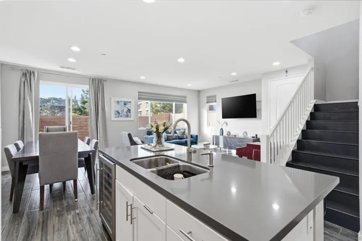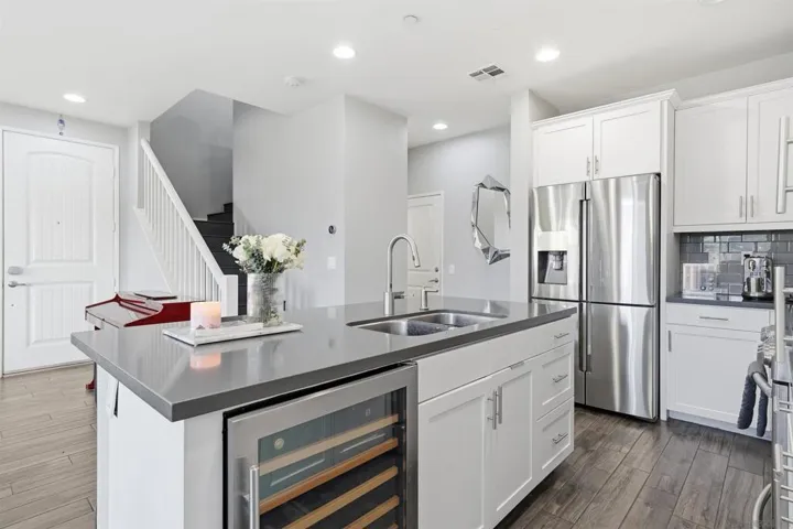 Welcome to this stunning two story townhome offering 1,686 square feet of thoughtfully designed living space with 3 bedrooms and 2.5 bathrooms. Upstairs features the spacious primary suite, a true private retreat with generous proportions ideal for rest and relaxation, along with two additional bedrooms and a versatile flex space perfect for a home office, gym, or play area. Plantation shutters throughout the home add both style and privacy. The first floor showcases elegant porcelain wood like tile flooring, creating a warm, modern feel across the main living areas. The kitchen is well appointed with stainless steel appliances and a wine fridge, ideal for entertaining. A convenient half bath is located downstairs, along with direct access to the two-car garage. Step outside to your private backyard with pavers, offering a low-maintenance space perfect for relaxing or hosting guests. The community offers fantastic amenities, including a resort style pool and jacuzzi, as well as multiple parks with playgrounds scattered throughout the neighborhood, providing great options for recreation and outdoor enjoyment. Ideally located just 2 minutes from freeway access, this home delivers exceptional convenience. You’re only 5 minutes from the high school, movie theater, shopping centers, and Kaiser Permanente, making daily errands and commutes effortless. This townhome seamlessly combines modern finishes, functional living spaces, and a prime location an opportunity you won’t want to miss.