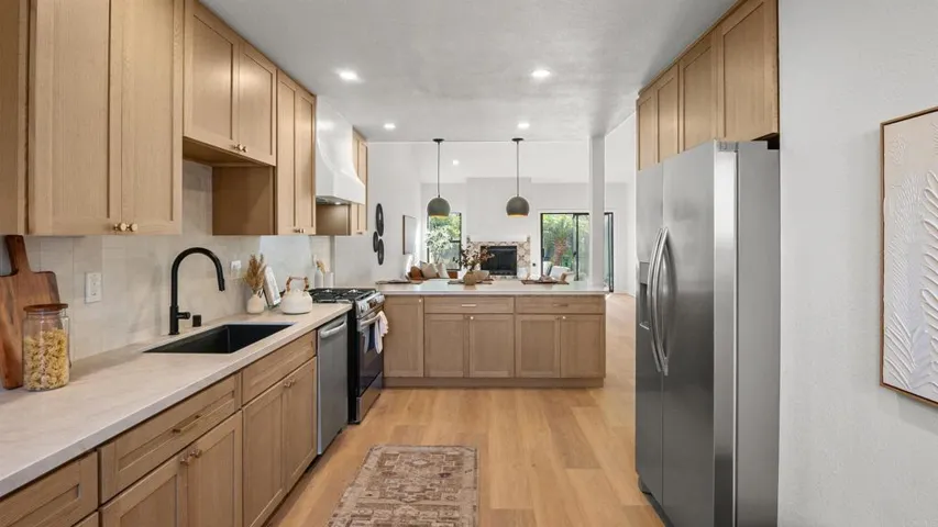 Welcome to this beautifully remodeled townhome in the sought-after Las Floras community of Bernardo Heights, offering the privacy and feel of a single-family home. This exceptional 3-bed/2.5-bath features a rare layout with two spacious primary suites—one conveniently located on the first floor and a second oversized suite upstairs, ideal for multigenerational living or hosting guests. The heart of the home is the stunning kitchen, showcasing honed Perla Venata countertops and seamless connectivity to the dining and living areas—perfect for both everyday living and entertaining. Luxury vinyl plank flooring flows throughout, complemented by soaring vaulted ceilings that enhance the home’s open, airy feel. Spa-inspired bathrooms feature double vanities in both primary suites, creating a true retreat-like experience. Upstairs, an additional flex room provides the perfect setting for a home office, gym, or creative retreat. Modern upgrades include a newer HVAC system and furnace, ensuring year-round comfort. Enjoy outdoor living with a charming front courtyard entry and a private rear patio, ideal for relaxing or entertaining. Residents of Bernardo Heights enjoy access to the Bernardo Heights Community Center, offering a true country club lifestyle with pools, spa, tennis courts, fitness room, billiards, newly added pickleball and basketball courts, and elegant lounge areas. Ideally located just a short walk to Lucido Park, Bernardo Heights Middle School, and Rancho Bernardo High School, this home blends luxury, convenience, and lifestyle in one of North County’s most desirable communities.