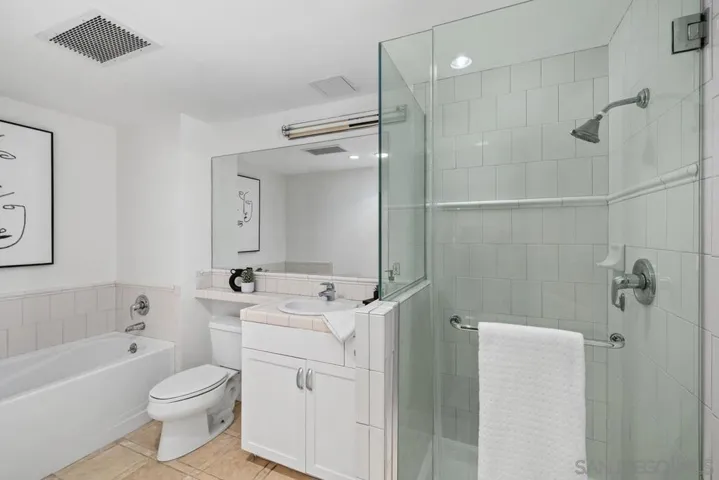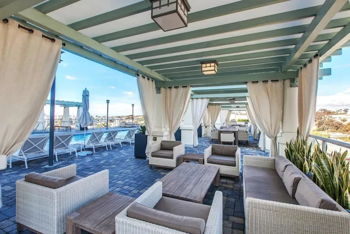 Discovery at Cortez Hill offers premium amenities including concierge service, 24-hour security, and a stunning rooftop deck with a lap pool, jacuzzi, cabanas, fire pits, BBQs, and panoramic views of San Diego. This freshly painted, 2-bed, 2-bath ground-level condo features brand-new carpet and combines downtown convenience with peaceful, residential living—perfect for families, pet owners, or anyone who prefers easy, stair-free access. Unlike many upper units that get full sun exposure and heat up quickly, this home enjoys natural shade and minimal direct sunlight, helping it stay cool and comfortable in the summer without running the A/C all day. Step outside to a rare, oversized private patio that opens to a lush community terrace—creating a serene, open-air feel rarely found in the city. The unit is also just steps from the building’s business center, library, and shared patio. Located just minutes from Balboa Park, Little Italy, and downtown—but tucked away in one of the city’s quietest, most desirable neighborhoods. Extremely dog-friendly, with one assigned parking space (G306) conveniently located near the entry gate and elevator.