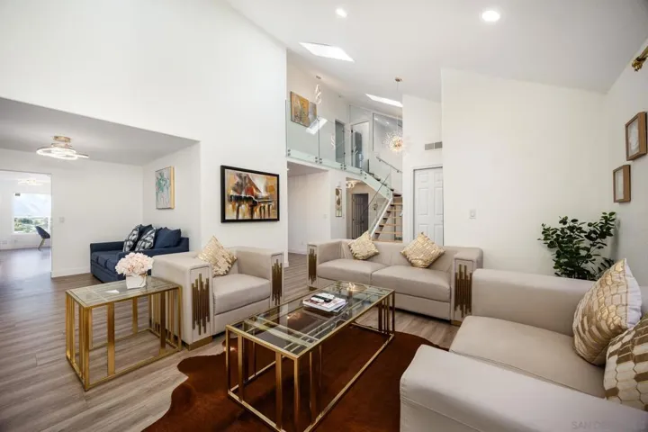 Welcome to this exceptional Del Cerro residence, a stunning two-story pool home offering panoramic west-facing canyon views and unforgettable sunsets. Designed for both luxury and flexibility, this 3-bedroom, 3.5-bath home includes a versatile flex 4th optional bedroom perfect for a home office, guest room, or nursery. The thoughtfully designed layout features three primary suites with full bathrooms, including one conveniently located on the ground floor—ideal for multigenerational living or guests. See supp… Upon entry, soaring vaulted ceilings in the living room create a dramatic first impression, complemented by abundant natural light, skylights, and designer lighting throughout. A custom glass-enclosed staircase adds a modern architectural statement. Entertain effortlessly with a formal living room, family room, formal dining room, and an additional casual dining area. The chef’s kitchen boasts quartz countertops, a large island, and extensive cabinet space, flowing seamlessly into the main living areas. Vinyl plank flooring runs throughout the home, adding warmth and durability. Upstairs, two primary suites open to a massive private balcony overlooking the pool and canyon views. The main upstairs primary retreat features a walk-in closet, double sinks, a floating vanity, barn door, and a spa-inspired shower with a waterfall showerhead. All bathrooms showcase custom tile work for a refined finish. The outdoor space is equally impressive, featuring a Trex deck, built-in grill, vinyl fencing, mature fruit trees, and palm trees in both the front and back yards—perfect for relaxing or entertaining. Additional highlights include a tile roof, solar, RV parking, turf landscaping in the front yard, a dedicated laundry room, double front doors, and a two-car garage. This light-filled Del Cerro home combines modern design, flexible living, and resort-style outdoor amenities in one of San Diego’s most desirable neighborhoods.