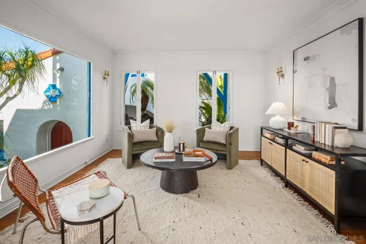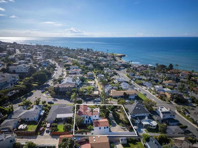 Perched on the hill in coveted Sunset Cliffs, this stunning 1920s Spanish Revival estate captures sweeping ocean views, dramatic sunsets, and timeless architectural charm. The two story 2,852 sq ft residence offers 4 beds and 4 baths on an exceptionally rare 13,800 sq ft lot with a detached guest house, observation balcony, alley access, & endless potential. Classic Spanish details include a red barrel tile roof, arched doorways, stained glass windows, ornate plaster moldings, original hardwood flooring, & dramatic tiled staircase. The formal grand living room features an oversized brick fireplace & arched windows that frame the ocean views. The main floor flows seamlessly from the formal entry to the living room, den, dining room, breakfast room, kitchen with island, built-ins, and vintage gas stove, as well as a bedroom, bathroom, & laundry room. Upstairs, the ocean views abound in the primary suite with ensuite & there are two additional bedrooms with a spacious hall bathroom. The observation balcony showcases the panoramic ocean views & the Juliet balcony overlooks the backyard. The detached guest house offers a gas fireplace, kitchenette, bathroom, walk-in closet, Juliet balcony, & a multitude of windows showcasing the ocean views. Outdoor spaces include a private brick patio, fountain, courtyard, lush landscaping, and multiple settings for entertaining or relaxing. A long driveway leads to a two car garage with workshop & storage. This is a rare opportunity to own a character rich Spanish Revival legacy property with ocean views in highly sought after Sunset Cliffs.