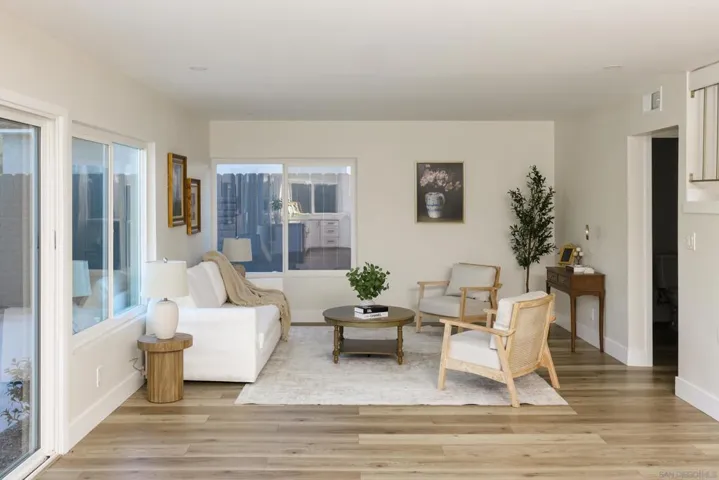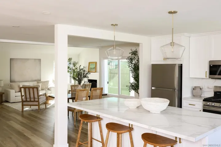 This beautifully remodeled, fully permitted Mira Mesa home was designed with flow, function, and everyday living in mind. The first floor features a true open layout with no step-downs and a full bathroom, ideal for guests, multigenerational living, or future flexibility. The kitchen anchors the home with quartz counters, a full-height matching backsplash, and an oversized island that naturally becomes the gathering space. Out back, the level yard offers usable outdoor space with turf for easy upkeep; perfect for kids, pets, or entertaining without constant maintenance. Upstairs, an open loft creates options for a home office, playroom, media space, or can be enclosed to add a fifth bedroom. The primary suite is set apart with its own walk-out balcony and a large walk-in closet, giving it a true retreat feel. This stunning home is a RARE find in Mira Mesa!
