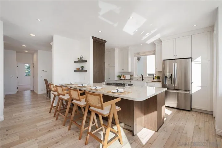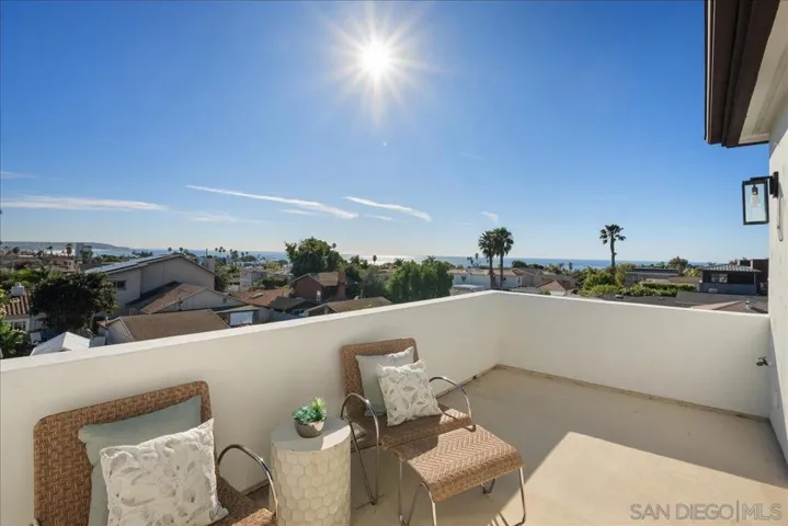 Wake up to ocean air, golden light, and the rhythm of coastal living in this exceptional Pacific Beach home, where every level is designed to capture views, light, and moments worth savoring. This thoughtfully updated residence offers a rare blend of space, flexibility, and panoramic scenery—perfect for those who want to live the beach lifestyle without sacrificing comfort or style. From the moment you step inside, sunlight pours through skylights and soaring ceilings, setting the tone for relaxed elegance. Mornings begin in the open kitchen, where bay windows frame soft coastal light and coffee is poured at the island before the day’s adventures. Designed for gathering, the kitchen seamlessly connects to the dining area and living room, where sliding doors open to an ocean-facing deck—an effortless extension of indoor-outdoor living and the perfect place to unwind as the sun sinks into the Pacific. The home’s layout invites both connection and privacy. Two guest bedrooms and a full bath on the main level offer comfort for family and friends, while upstairs a bright and flexible bonus family room or office space offers flexibility for work-from-home days, creative space, or a cozy media lounge. The bonus space opens to an additional view deck shared with the primary suite where days are filled with natural light from the wall of windows and evenings are spent watching the sky change colors before settling into a spa-inspired bath beneath a skylight in the primary bath. Above it all, the rooftop deck is where memories are made—sunset gatherings, stargazing, and panoramic views stretching from the ocean to the city lights. With a 50-amp outlet ready for a hot tub, this space is primed for unforgettable nights under the stars. On the lower level, a practical mudroom connects easily to the garage and covered carport, while outside, a fully fenced backyard with grassy area and alley access provides room to play, relax, or simply enjoy the coastal breeze. Located in the heart of Pacific Beach and within the La Jolla School District, this home places you moments from sandy beaches, neighborhood coffee shops, acclaimed dining, the boardwalk, Bird Rock, and La Jolla Shores. Whether it’s sunrise walks by the water, afternoons spent entertaining on the deck, or evenings capped by ocean views and city lights, this is more than a home—it’s a lifestyle defined by sun, sea, and Southern California living.