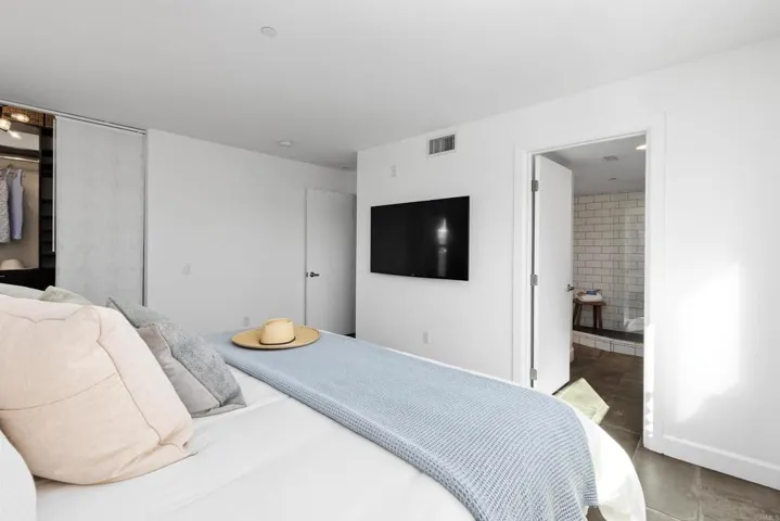 Located near the heart of Downtown Oceanside, this end-unit residence offers a sophisticated blend of modern design and coastal city living. Bathed in natural light and framed by striking star-lit views. This home showcases high-end finishes throughout and delivers a truly turnkey, move-in-ready experience. The kitchen and bathrooms showcase custom cabinetry, complemented by leathered granite countertops, while fully tiled vanity walls in the bathrooms add durability and elevated design. Concrete and tile flooring enhance the contemporary aesthetic while offering effortless maintenance, perfect for beachside living. A first-floor bedroom and bathroom provide ADA accessibility. The second level features a stunning primary suite with a spacious walk-in shower and two generous walk-in closets, an additional bedroom with an en-suite bathroom, and an oversized bonus room with a private balcony, ideal for an office, creative retreat, or fourth bedroom. The private rooftop terrace serves as the Star, offering sweeping 360-degree views of the ocean, mountains, and city lights. One of only two end units offering spacious living, turnkey condition, and expansive views, this residence truly stands apart. Designed for a city-style, on-the-go coastal lifestyle, this home offers convenient access to nearby beaches, bike trails, the train station, acclaimed dining, artisan coffee shops, local wineries and breweries, fitness studios, the Star Theater, cultural venues, the Oceanside Harbor, weekly farmers’ and sunset markets, shopping, and more. ViewPointe amenities include secure gated underground parking with two assigned side-by-side spaces, two secured lobbies, elevators, additional storage locker, bike lock-up station, sauna and shower facilities.