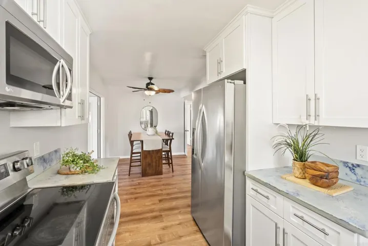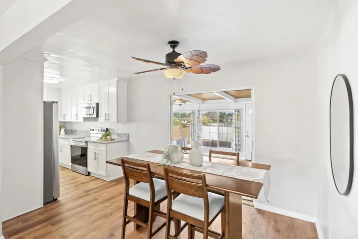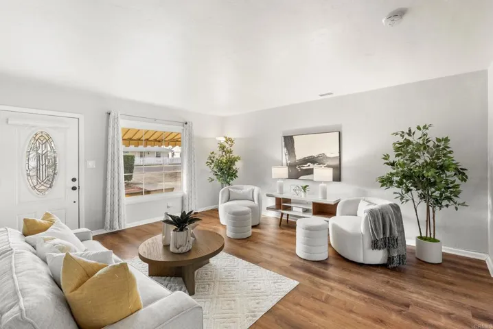 This thoughtfully updated Lemon Grove home blends classic charm with modern upgrades throughout. A welcoming front porch sets the tone and invites you inside, where a spacious living room flows seamlessly into the dining area and kitchen, creating an ideal layout for everyday living and entertaining. The remodeled kitchen features sleek cabinets, modern countertops, stainless steel appliances, and updated finishes that make the space both functional and stylish. Flooring has been upgraded throughout the home, adding a refreshed look. The primary bedroom offers a comfortable retreat with a remodeled ensuite bathroom, complete with a walk-in shower, contemporary vanity, updated mirror, and modern light fixture. The second bathroom has also been upgraded and features a stylish double-sink vanity, updated mirrors and lighting, making it well-suited for guests or shared use. Just off the dining area, a spacious bonus room provides incredible flexibility and can easily serve as a family room, entertainment space, game room, or home office. Outside, the large backyard presents a true blank canvas, ready for the next owner to design a gathering space tailored to their lifestyle. The home has seen other improvements in recent years, including newer windows, interior sliding door, water heater, garage door, electrical panel, backyard fencing, and updated heating and cooling systems. With its inviting layout and extensive updates, this move-in-ready Lemon Grove home offers comfort, versatility, and opportunity.