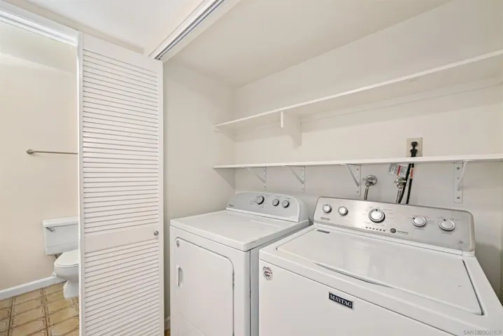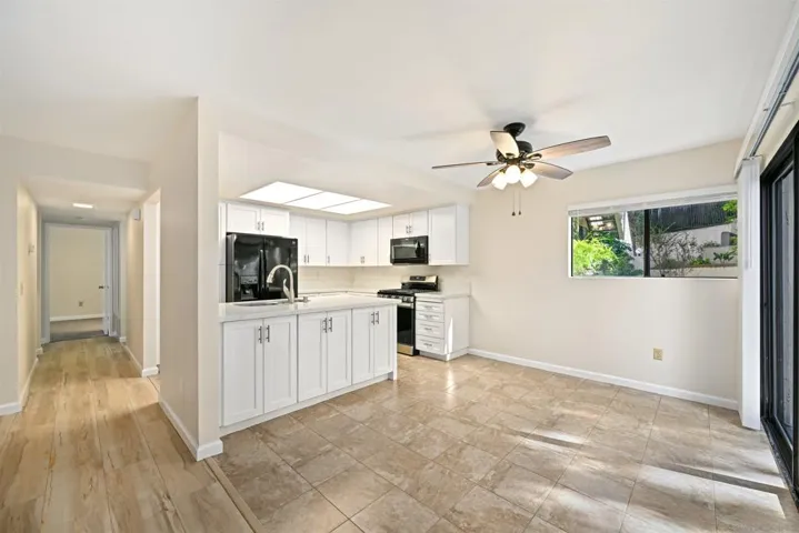 Spacious and well-maintained ground-floor corner unit offering two bedrooms, two full bathrooms, and a wide-open floor plan filled with natural light. Fresh paint throughout, soaring vaulted ceilings, and a cozy fireplace create a warm, inviting atmosphere across 1,172 square feet of comfortable living space. The living room and hallway feature newer laminate flooring, while both bedrooms have brand-new carpet for a fresh, move-in-ready feel. New blinds on all windows enhance privacy and style. The beautifully updated kitchen showcases quartz countertops, crisp shaker cabinetry, and a brand-new gas range, making it both functional and stylish. Bathrooms have also been refreshed with new shaker cabinets and quartz countertops. Enjoy the convenience of in-unit laundry and a quiet, well-situated location within the community. Step outside to your private patio, the perfect spot to unwind with your favorite beverage and enjoy the year-round coastal climate. A one-car detached garage plus an additional assigned parking space add everyday convenience. Residents of Melrose Park enjoy resort-style amenities including sparkling pools and a sport court. Ideally located just minutes from vibrant Vista Village, offering cafes, boutiques, Wave Waterpark, and entertainment, with quick freeway access for easy commuting. This is a must-see home!