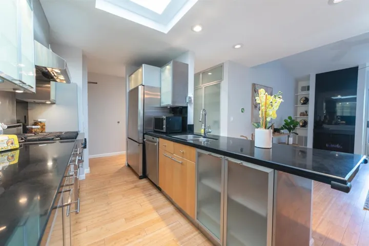 Top-floor contemporary condo in the heart of Mission Valley offering style, comfort, and valley views. The 1-bedroom, 1-bath residence spans approximately 700 square feet and features vaulted ceilings in both the living room and bedroom—an exclusive benefit of its premier top-floor location in a three-story building. Beautifully upgraded just a few years ago, the home showcases bamboo flooring throughout, a stunning custom-designed walk-in shower, and a remodeled kitchen complete with a Viking stove. Natural light fills the space through multiple skylights enhancing the open and airy feel. The living room centers around a cozy gas fireplace with smart home controls for lighting and fireplace operation, and opens to a private deck/balcony—perfect for enjoying Mission Valley views and evening city lights. Additional highlights include central heating and air conditioning, an EV charger at the assigned covered parking space. The building offers elevator access for added convenience. Residents enjoy resort-style amenities including a swimming pool, spa, tennis and pickleball courts, basketball court, fitness center, and a recreation room with two pool tables. Ideally situated in the Fashion Valley area with quick access to Interstate 5 and Interstate 8, the central location offers close proximity to shopping, dining, and everything San Diego has to offer. Experience elevated Mission Valley living in this thoughtfully upgraded, move-in ready home.