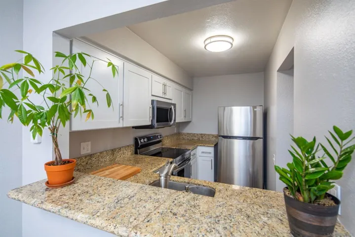 Welcome to Mission Valley – Park Villas South Condominiums. This top floor studio condo is in the heart of Misson Valley. The kitchen offers stainless steel appliances, spacious granite countertops, and ample cabinet storage. The separate dining room with bar-height seating is open to the kitchen. The natural sunlight streams through the sliding glass door that opens onto the private balcony. Easily park in the assigned parking space. Park Villas South Condominiums offers a pool, spa, BBQs, and community laundry. You’ll be less than 1 mile to shopping, dining and entertainment.